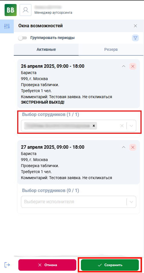 После выбора сотрудника Нажмите "Сохранить". После сохранения в графике будут созданы соответствующие выходы, а помощник розницы сможет в своем интерфейсе ознакомиться с откликами на созданные им окна возможностей. Если заявка была закрыта частично, она останется в списке активных для донабора оставшихся исполнителей.