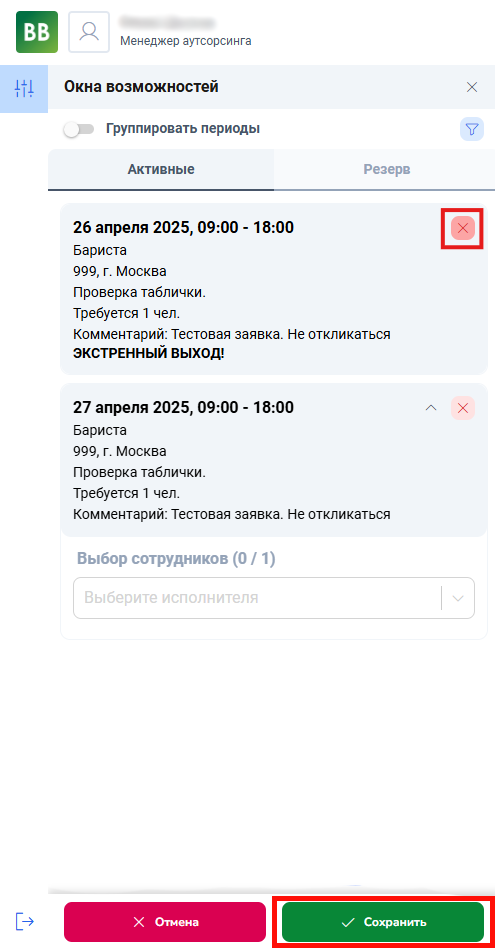 При необходимости вы можете удалить ненужные заявки из списка. Для удаления нажмите на красную иконку крестика и появившуюся в нижней части экрана кнопку “Сохранить”.