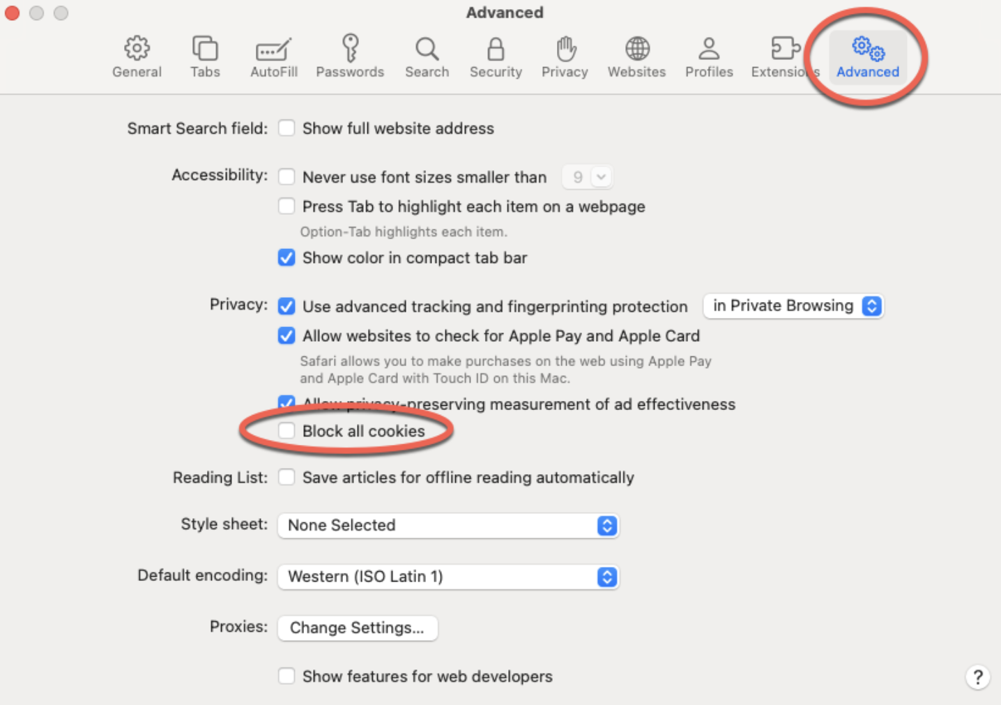- Найдите пункт Block all cookies Блокировать все файлы cookie