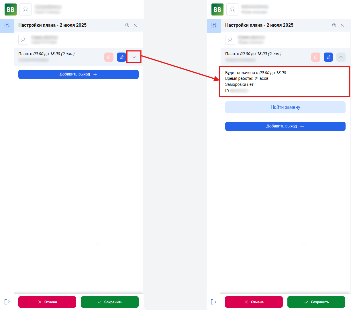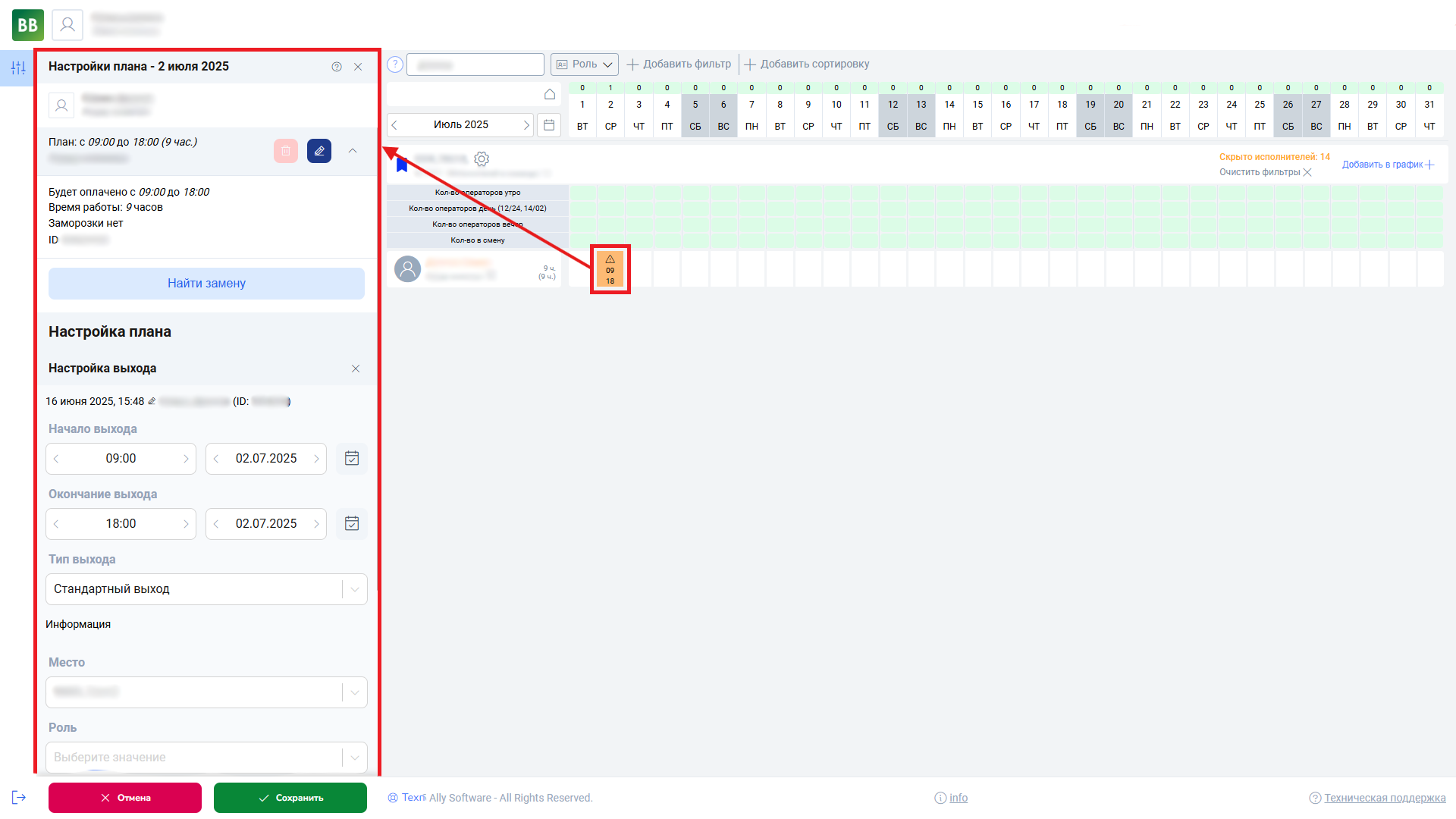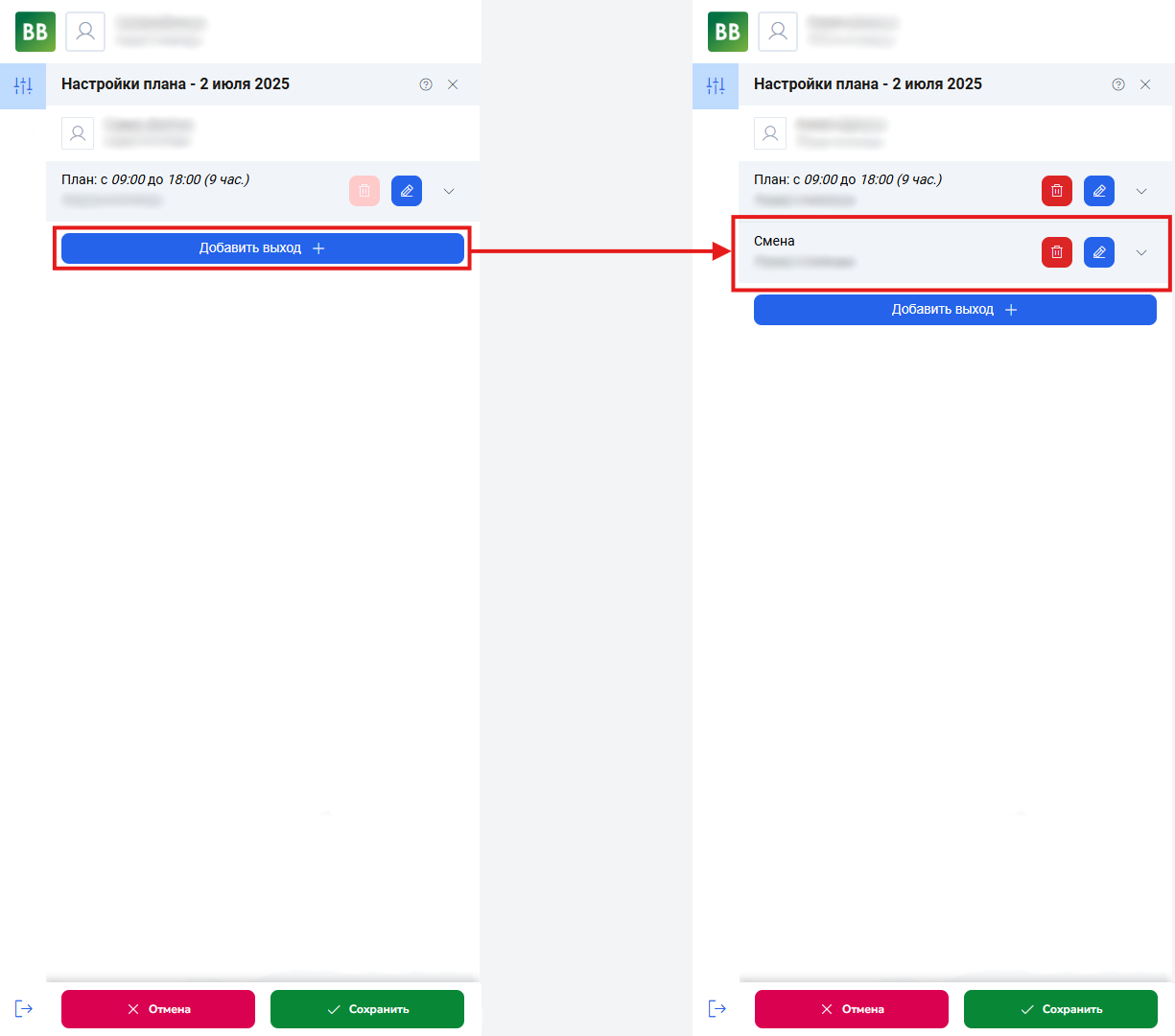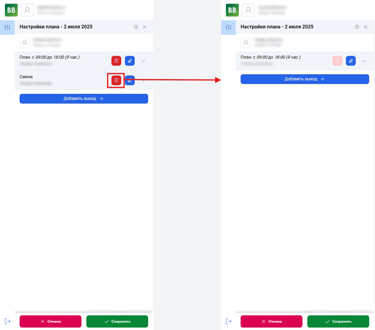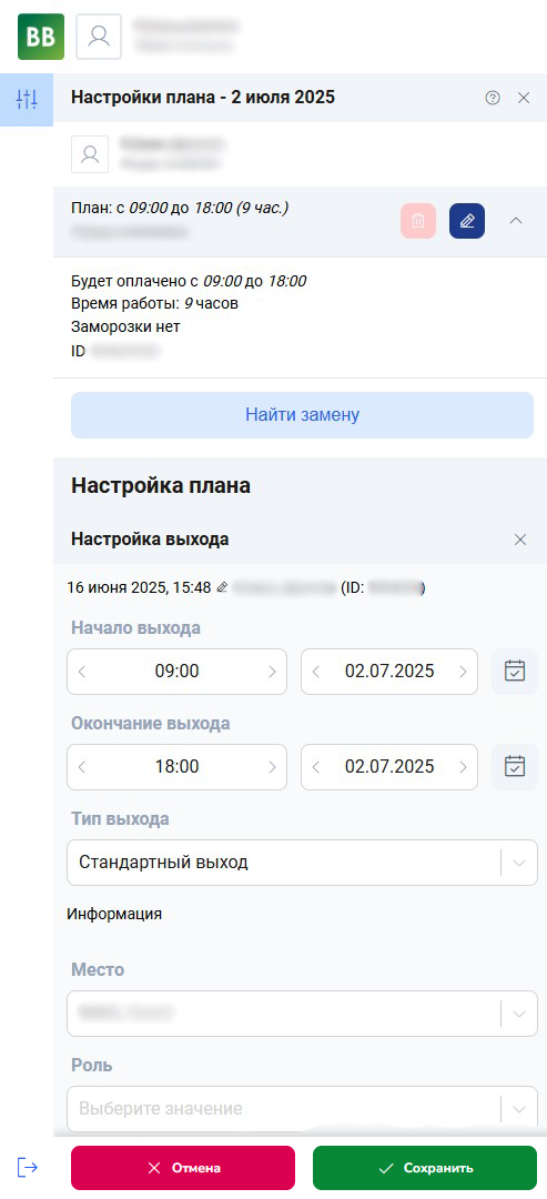 Настройка выходов в выбранный день выполняется через форму «Настройка плана» в левой панели. В этой форме отображаются все запланированные выходы сотрудника в этот день, которые можно посмотреть и редактировать.