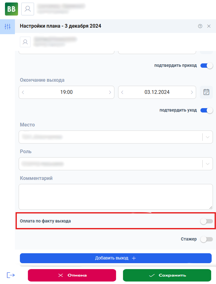 В форму редактирования выхода для сотрудников доставки добавлен переключатель "Оплата по факту". Переключатель доступен только для выходов типа "Смена" с указанным плановым временем начала и окончания.
