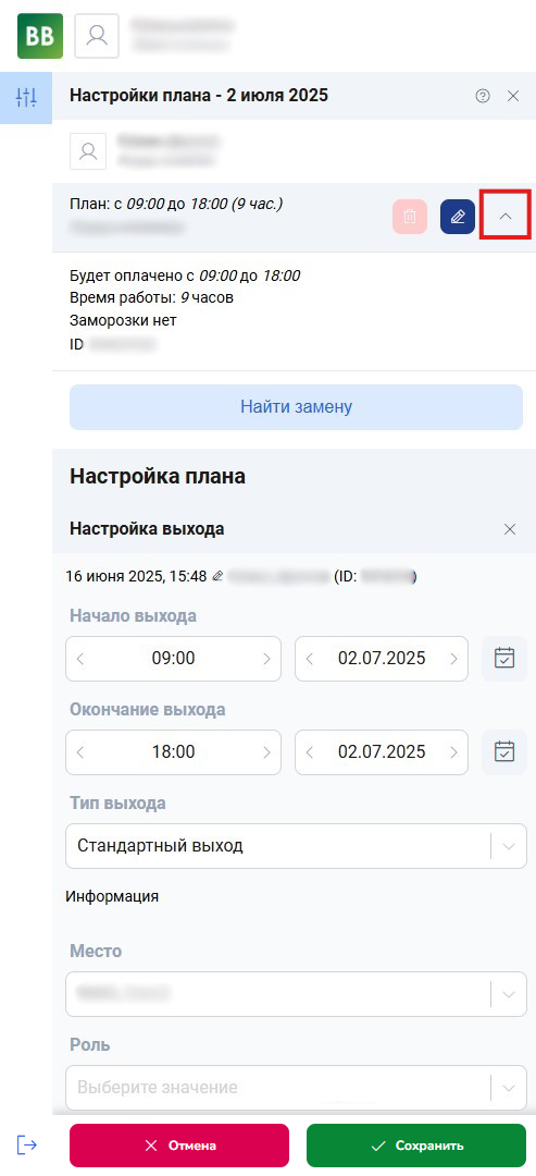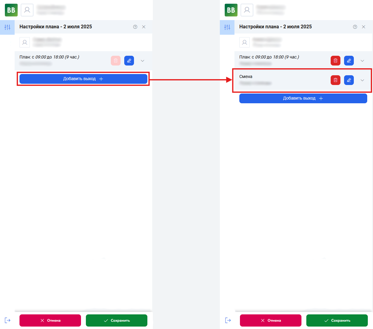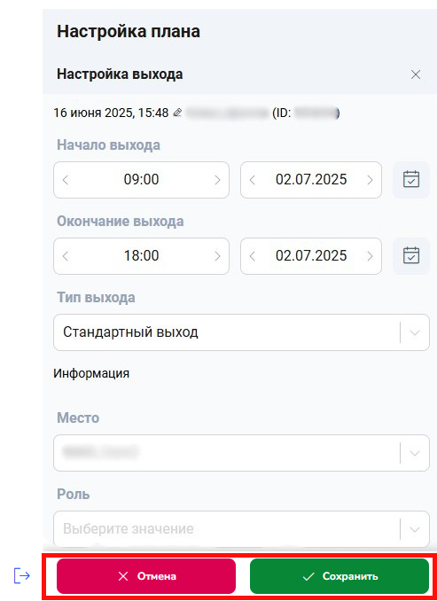 Обратите внимание, изменения выходов в дне необходимо сохранить. Без сохранения они не отразятся в графике, и сотрудники их не увидят.