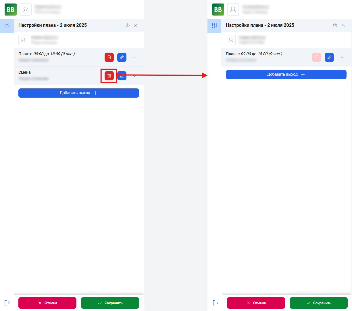 Кнопка "Удалить" помечает все выходы выбранного дня на удаление.