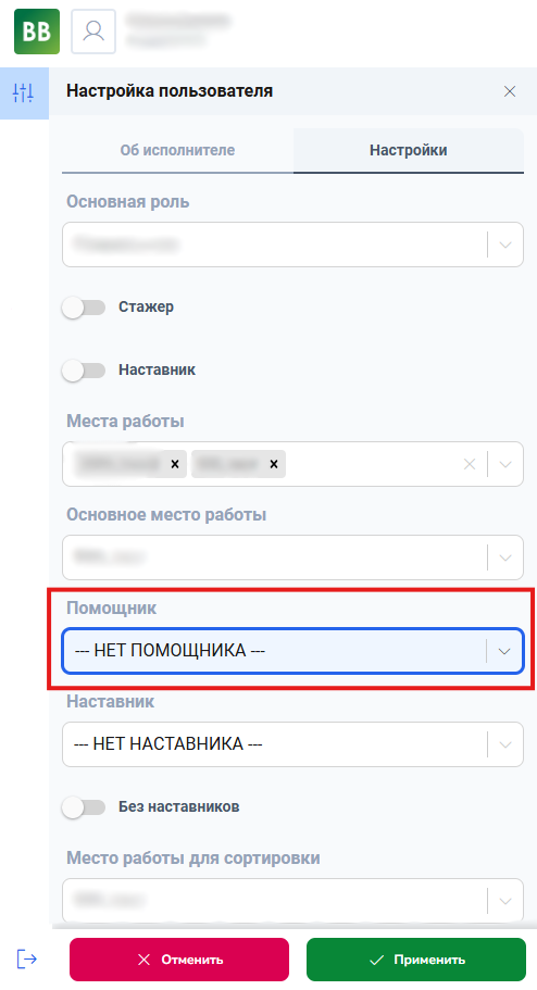 Чтобы назначить помощника сотруднику, откройте профиль сотрудника, найдите поле "Помощник" в разделе “Настройки” и выберите нужного сотрудника из выпадающего списка.