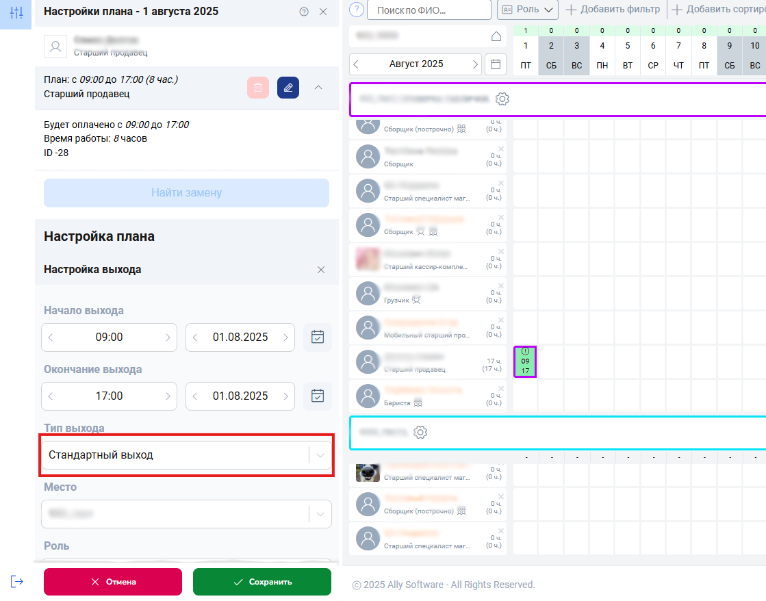 | Стандартный выход (смена) | Можно, но не должен пересекаться со временем смены |