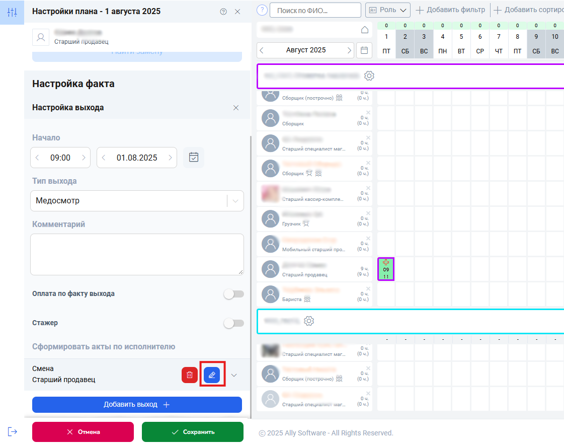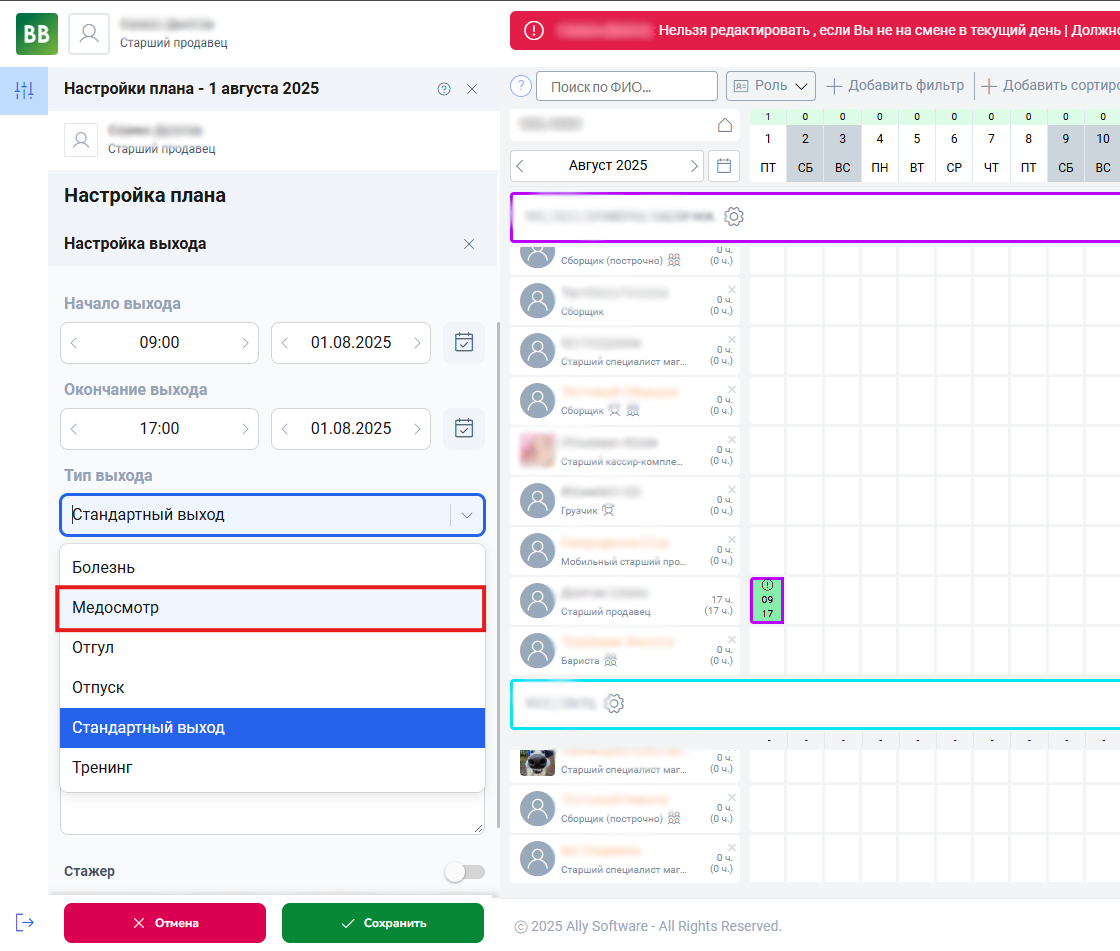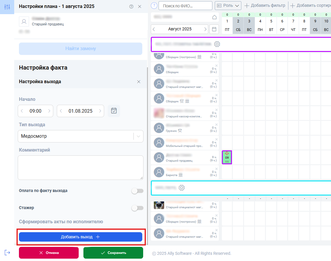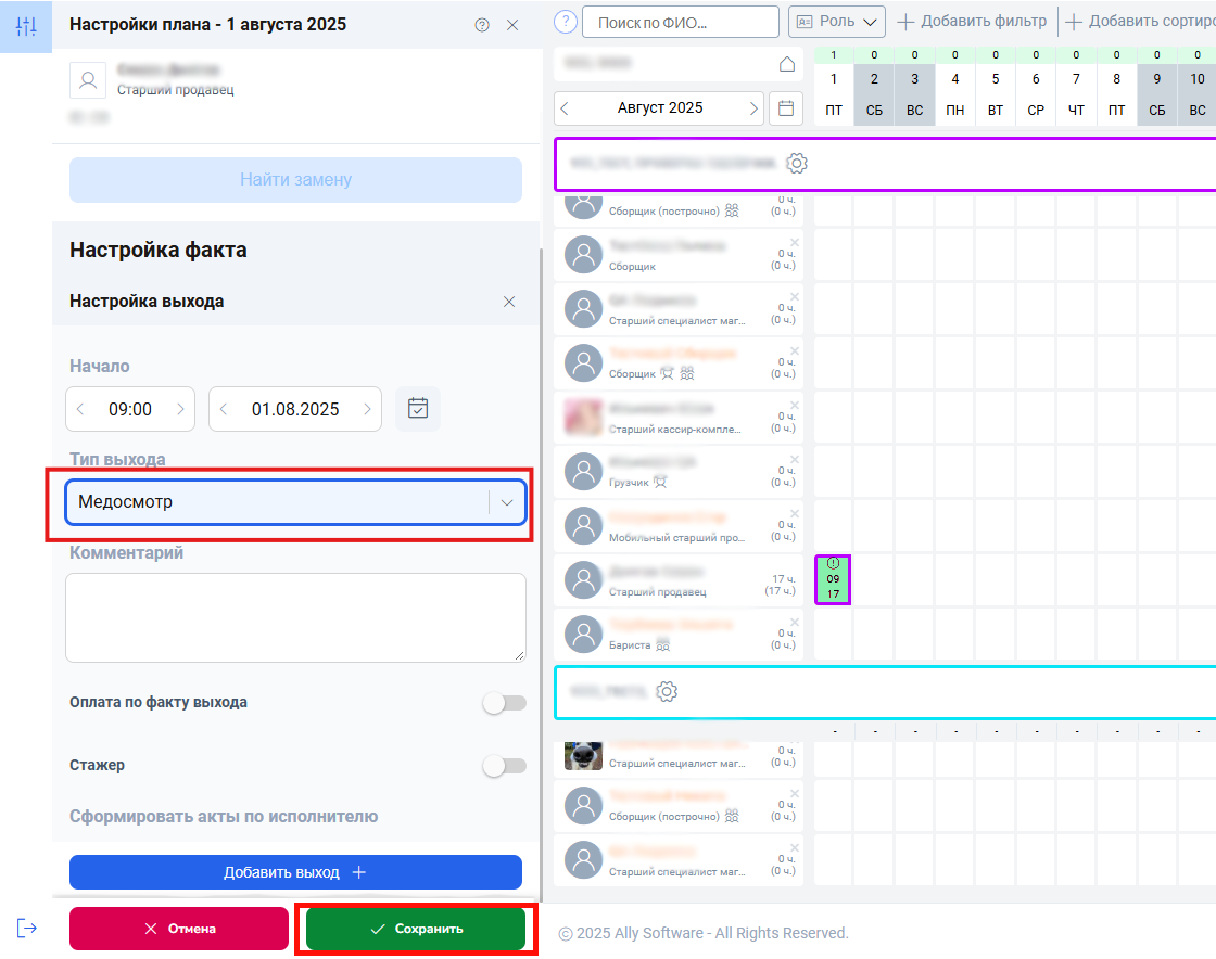 Медосмотр не блокирует назначение других смен в тот же день, однако время выходов не должно пересекаться. Чтобы добавить смену в день медосмотра, откройте окно настроек и нажмите кнопку «Добавить выход».