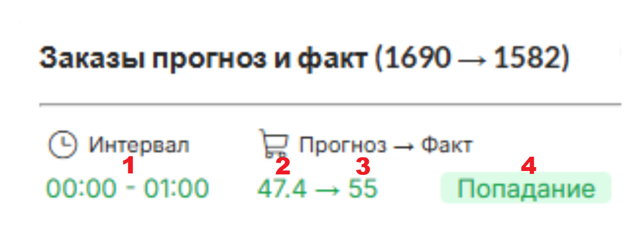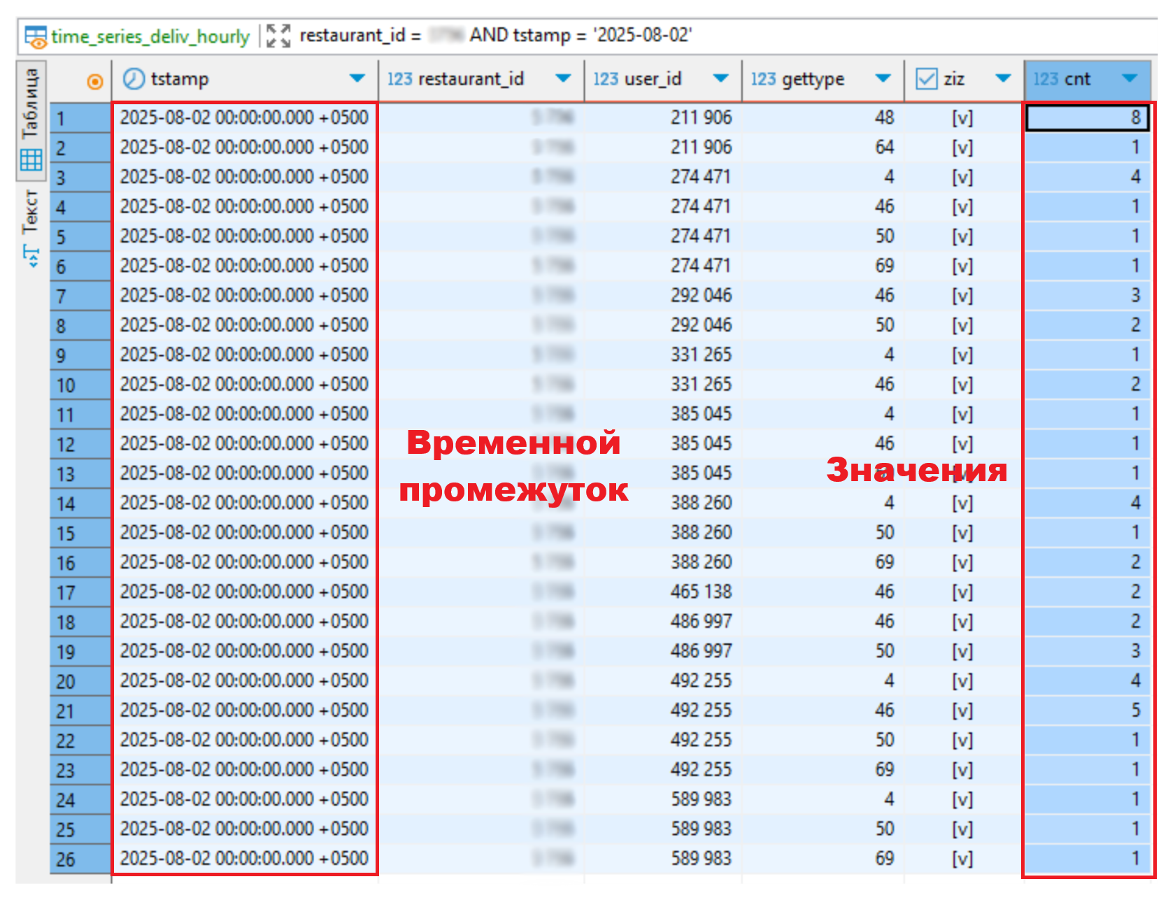 Фактическое значение рассчитывается из представления time_series_deliv_hourly, созданного на основе таблицы time_series и содержащего данные о заказах курьеров. Количество заказов определяется суммированием значений поля cnt (количество доставленных заказов) всех записей за выбранный интервал. Пример: для интервала 00:00–01:00 2 августа сумма значений cnt (8 + 1 + 4 + 1 + 1 + 1 + 3 + 2 + 1 + 2 + 1 + 1 + 1 + 4 + 1 + 2 + 2 + 2 + 3 + 4 + 5 + 1 + 1 + 1 + 1 + 1) равна 55.
