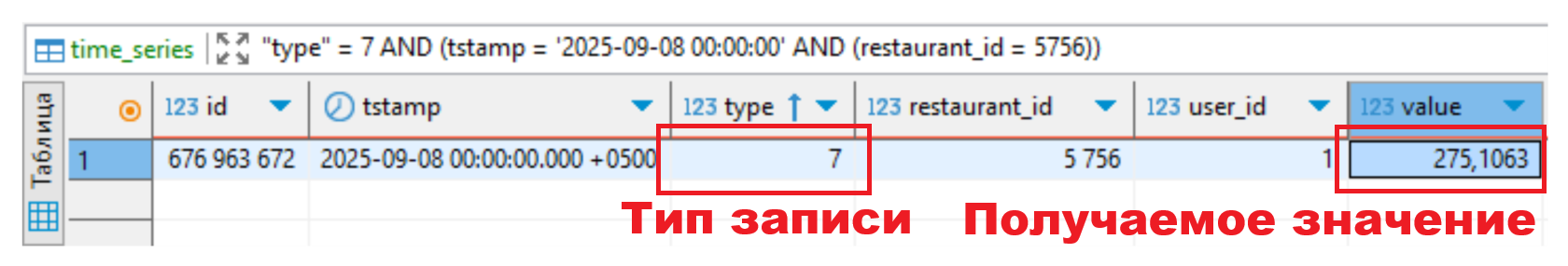 Прогнозное значение извлекается из таблицы time_series, из записей с типом 7 (обозначающим прогноз по геозонам для сборки заказов). Значение берется из поля value.