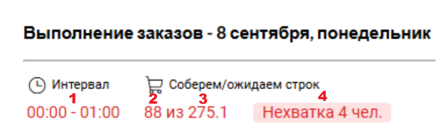 - Покрываемое количество заказов для указанного интервала (основывается на списке запланированных сборщиков и их индивидуальной скорости работы; механизм расчета описан в статье, пункты 1 и 2);