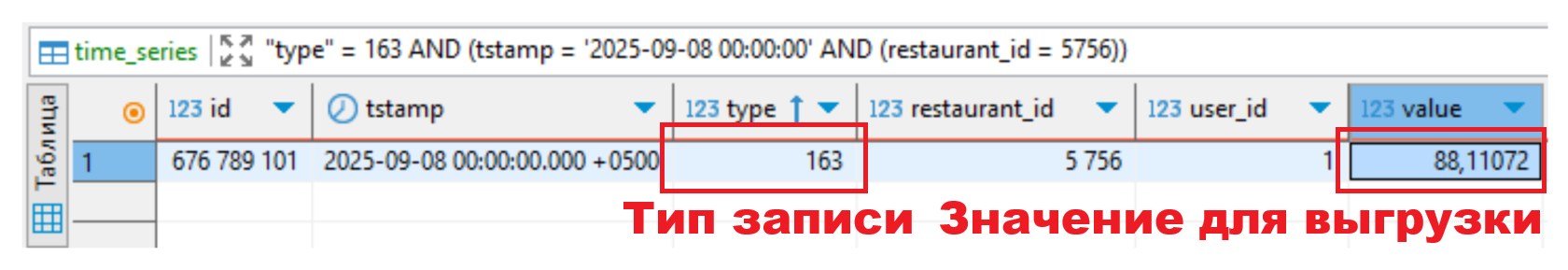 Так же, в таблице time_series в записях с типом 163 сохраняются данные, вычисляемые в базе данных по аналогичной схеме один раз в сутки и используемые для выгрузки.