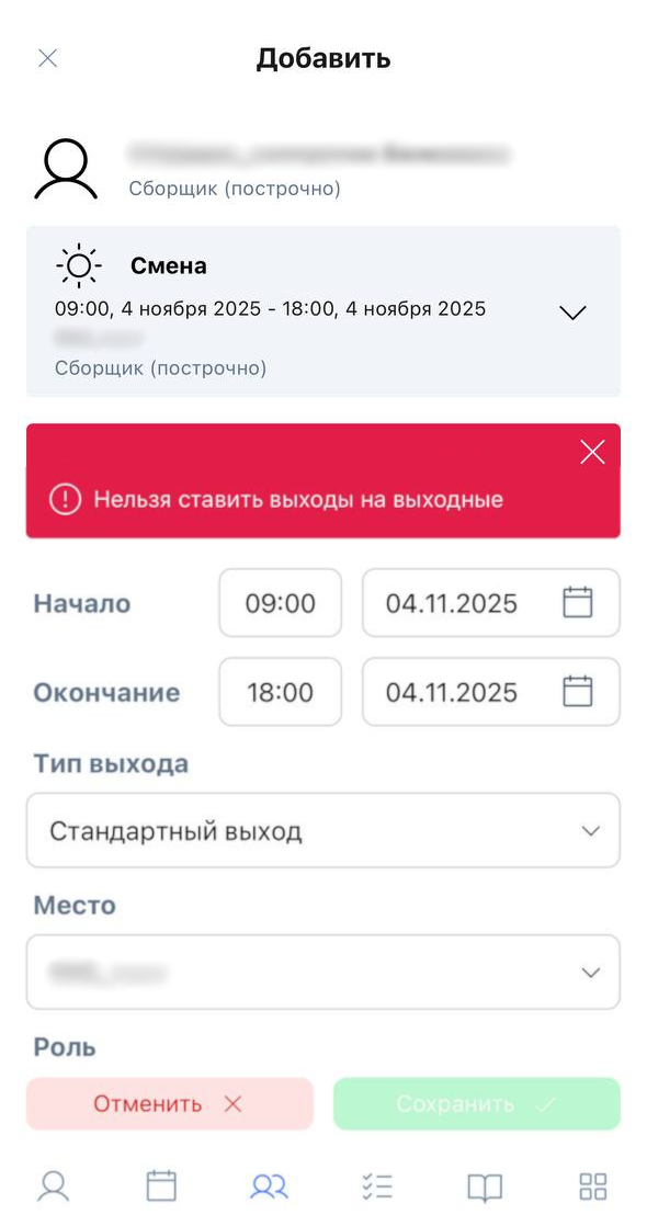 В субботу, воскресенье, праздник — смена ставиться не может, приложение выдаёт ошибку “Нельзя ставить выходы на выходные"
