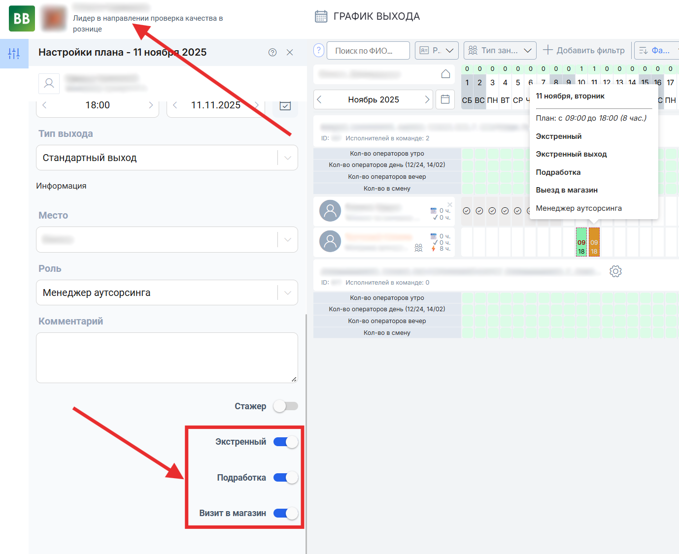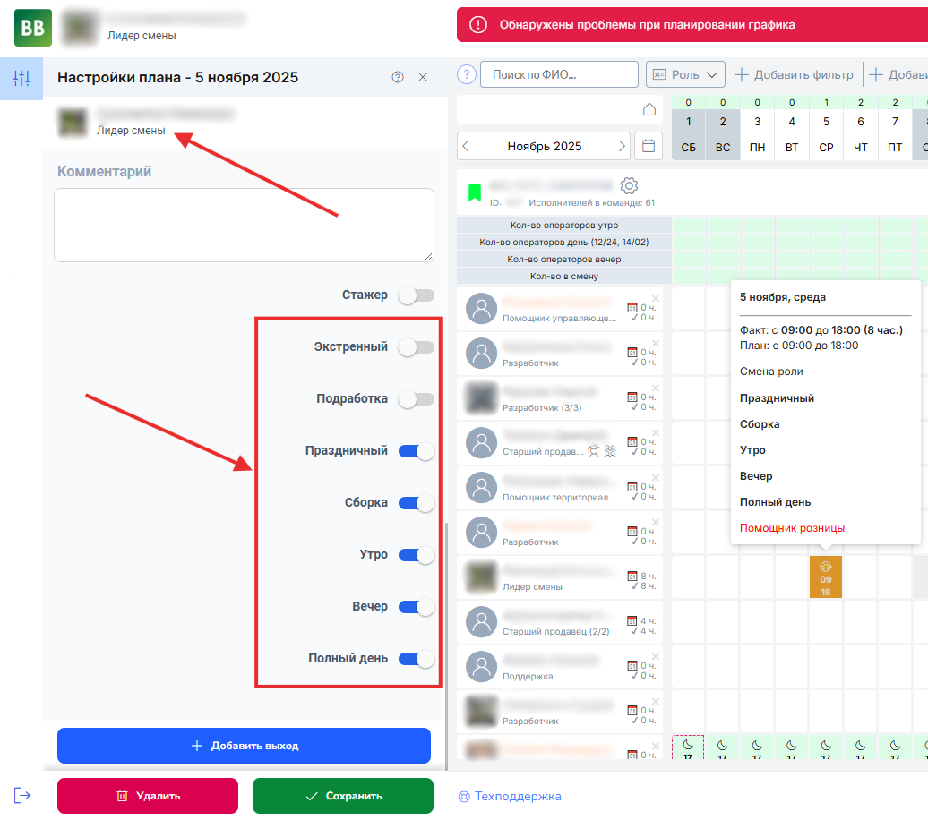 - Лидеры направления могут управлять сменами сотрудников, назначать перечисленные признаки смен и видеть их в графике