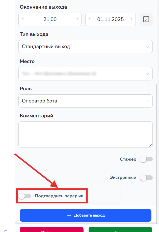 - Для ролей “Лидер команды” и “Временный лидер” в форме редактирования смены появился новый тогл – “Подтвердить перерыв”